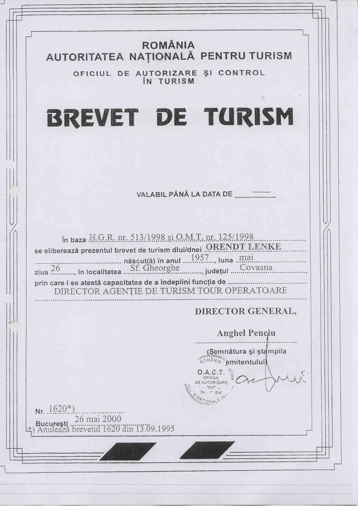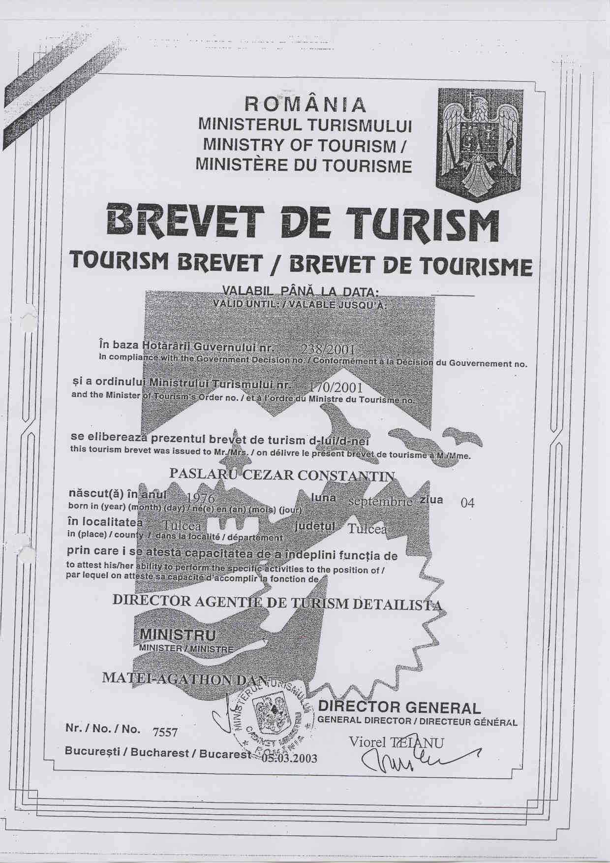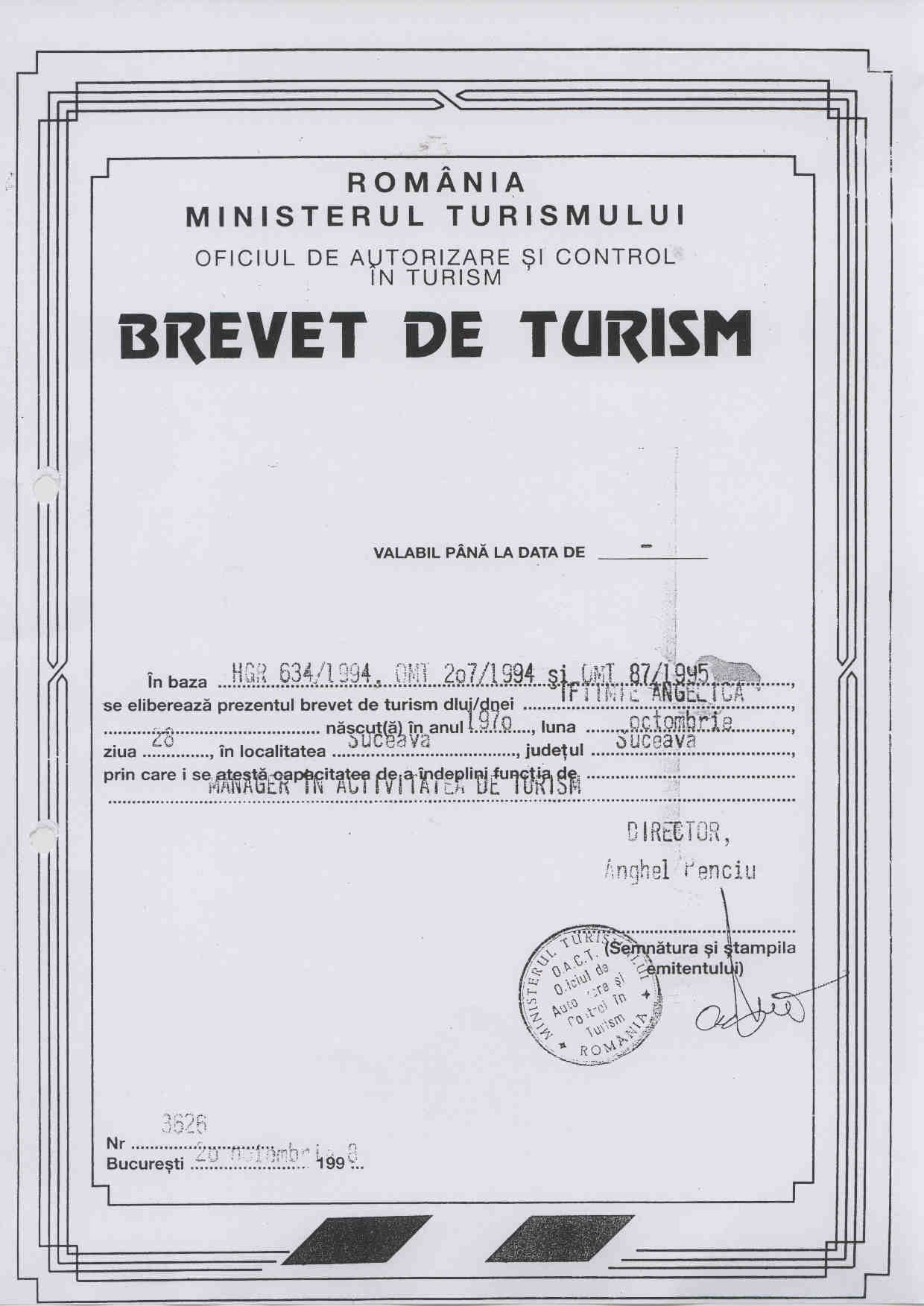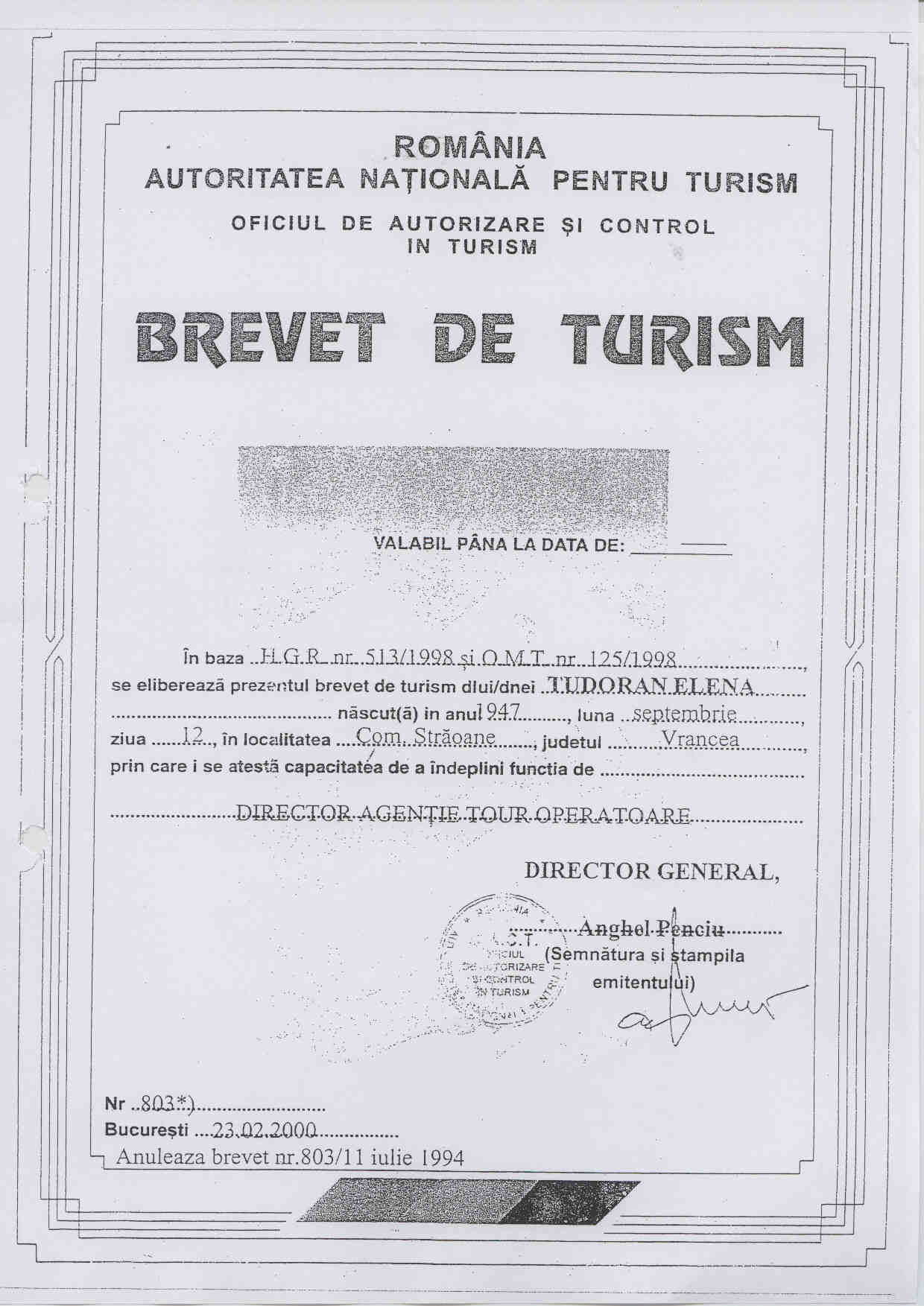 Brevet Turism -nr.20696 din 27.03.2012;