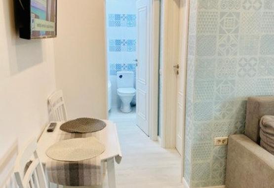 percepe taxe.Dotari camereStudiourile sunt prevazute cu aer conditionat, LED tv, wi fi, plase de tantari, masa si fier de calcat, masina de spalat rufe, centrala proprie si se compun din dormitor cu pat matrimonial (140x200) si o mini-chicineta echipata (frigider, microunde, plita, aparat de cafea si vesela) si o canapea extensibila (160x200), precum si baie cu cada si uscator de par. Fiecare camera are aer conditionat si tv, iar camerele sunt separate de usa. Nu au balcon. Suprafata 35 mp.