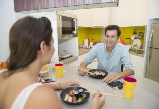 Toate suitele au un dormitor separat, o zonă de living și un balcon privat. Bucătăria este complet utilată cu toate ustensilele, perfectă pentru gătit in interior. Baia privată include duș cu apă caldă.