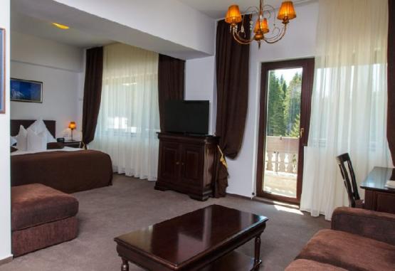 Ialomitei.Hotelul are o capacitate de cazare 49 camere si pune la dispozitia turistilor restaurant, sala de conferinta, piscina interioara, SPA, loc de joaca pentru copii, parcare.Fiecare camera are TV cu receptie prin satelit, radio, minibar, safe, acoperire 3G si acces WiFi nelimitatCamera dubla - are o suprafata de 18 mp, nu se poate adauga pat suplimentarCamera dubla executiv - are o suprafata de 26 mp, prevazuta cu canapea extensibilaSuita - are o suprafata de 42 mp. Pozitia televizorului separa vizual zona de dormit de zona de relaxare prevazuta cu o canapea extensibila si masutaSuita executive- are o suprafata de 40 mp, prevazuta cu o canapea extensibila Hotelul nu are in dotare paturi suplimentare.